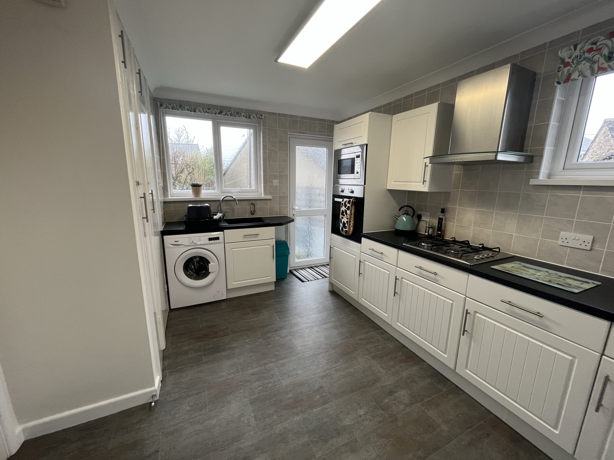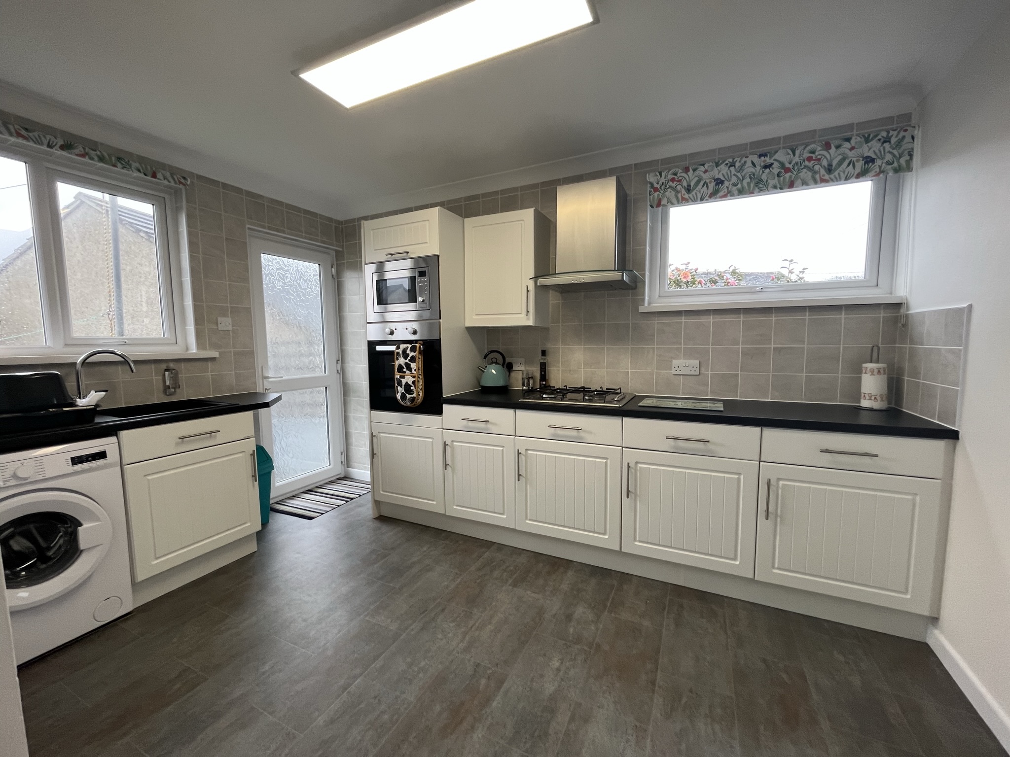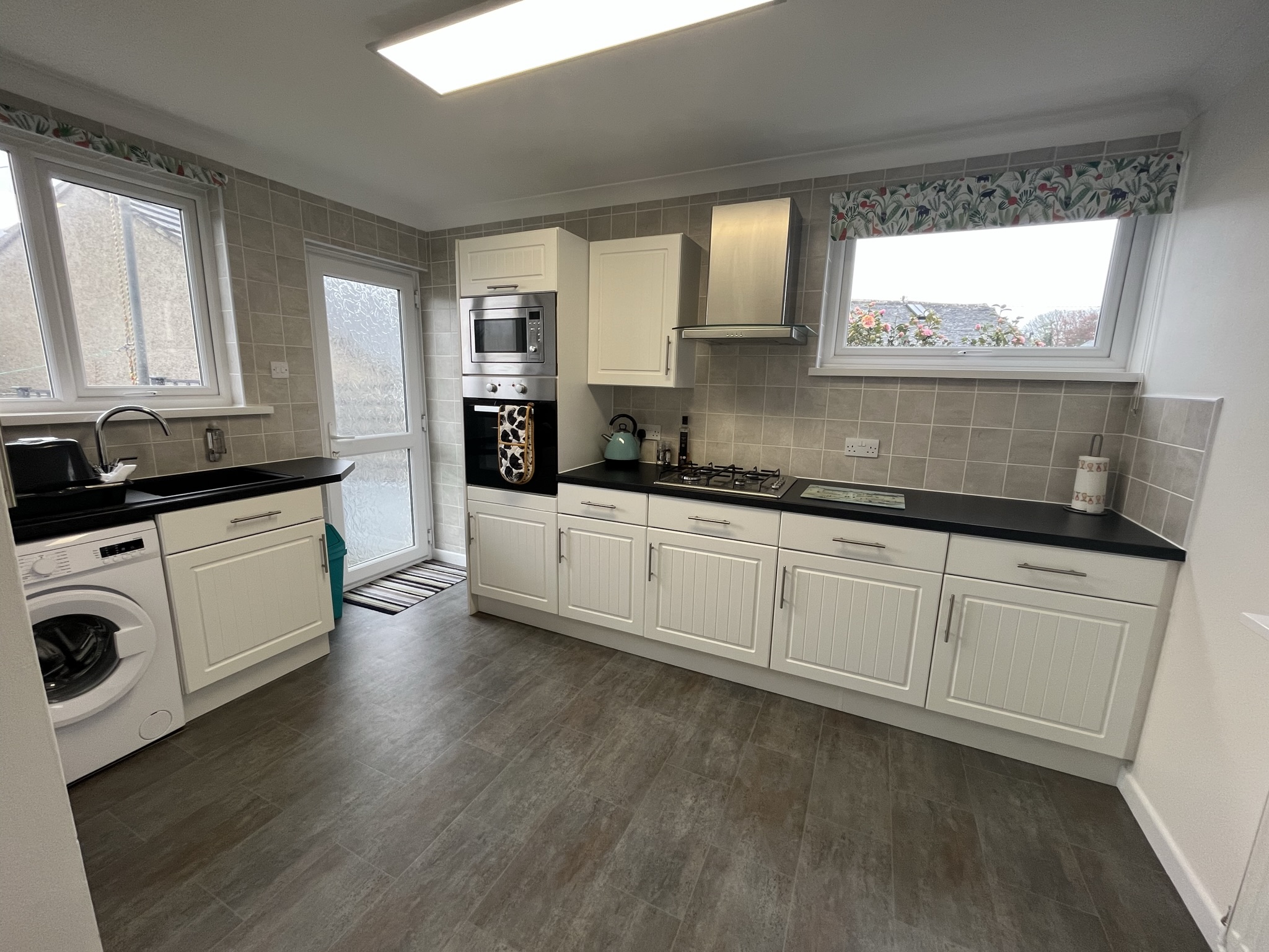 Fitted units, vinyl flooring, double glazing, integral gas hob and electric oven, microwave, plumbing for appliance and LPG fired central heating boiler.