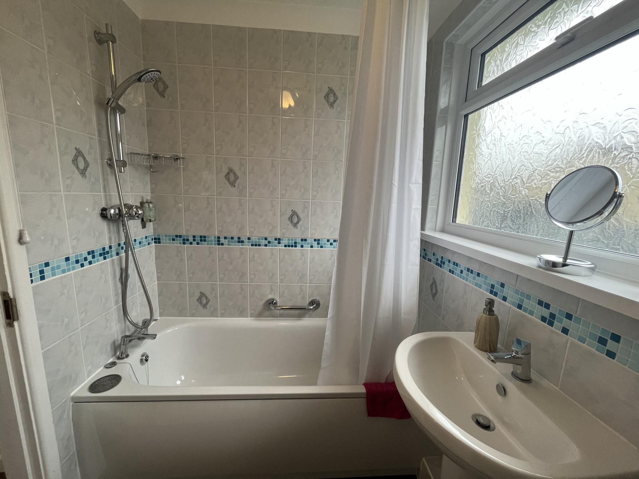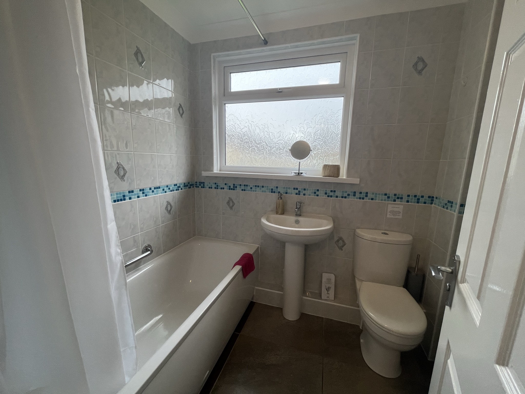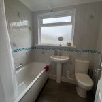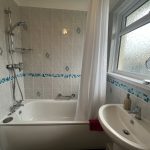 Bath with shower over, washbasin, low level wc, heated towel rail, tiled walls and floor and double glazing.