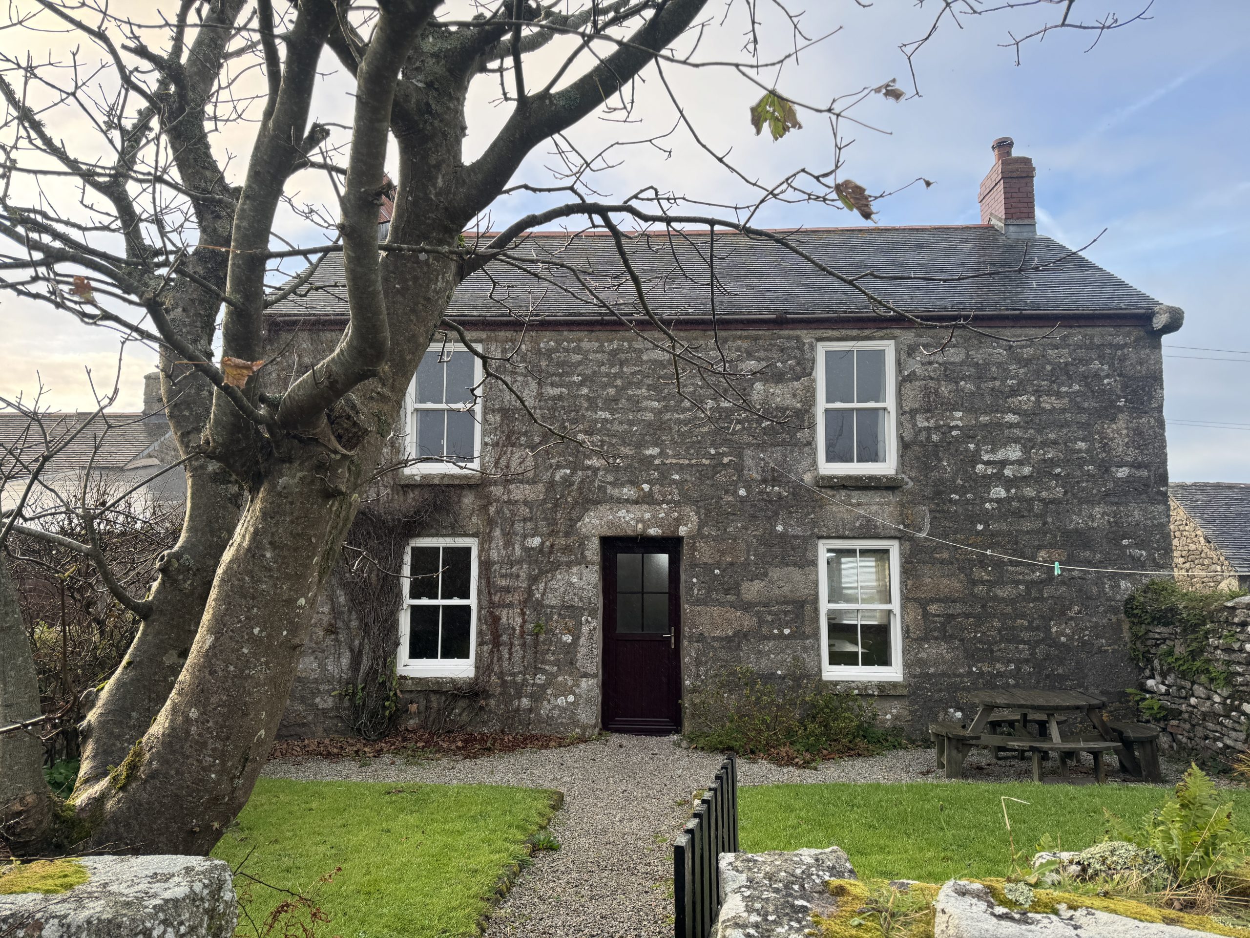Enclosed front garden with wooden gate and lawned areas, central pathway to front door.