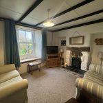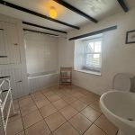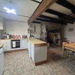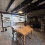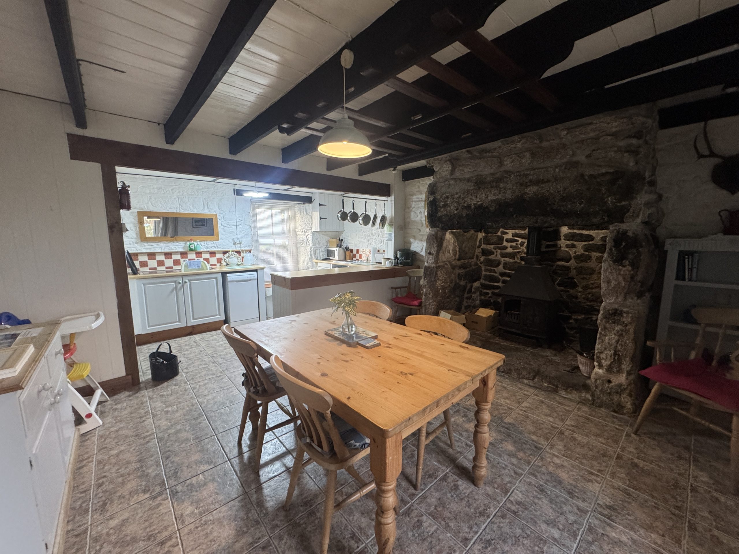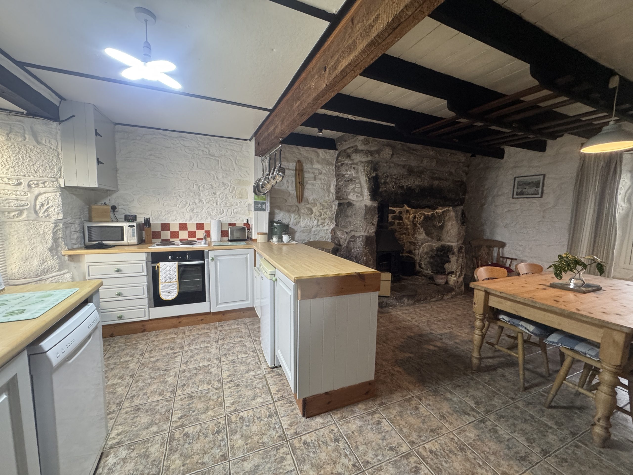 Tiled floor, wood burning stove, pendant lights and bulkhead light in large Inglenook fireplace.  Fitted base units, stainless steel sink, double glazed windows, beamed ceilings, utility area.
