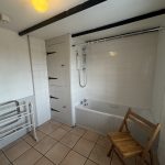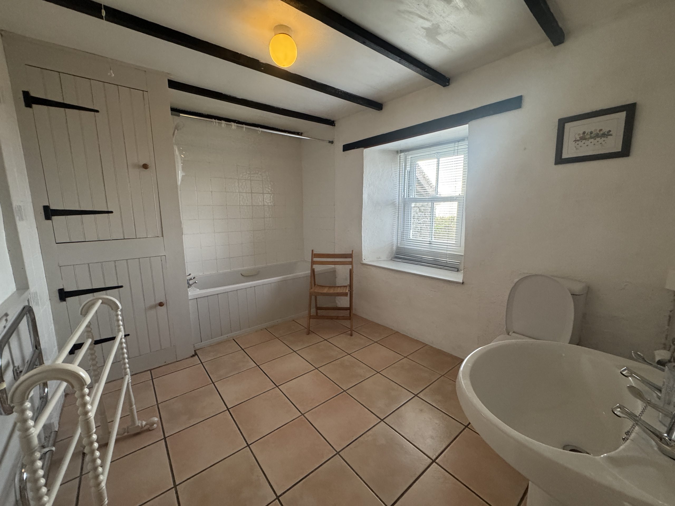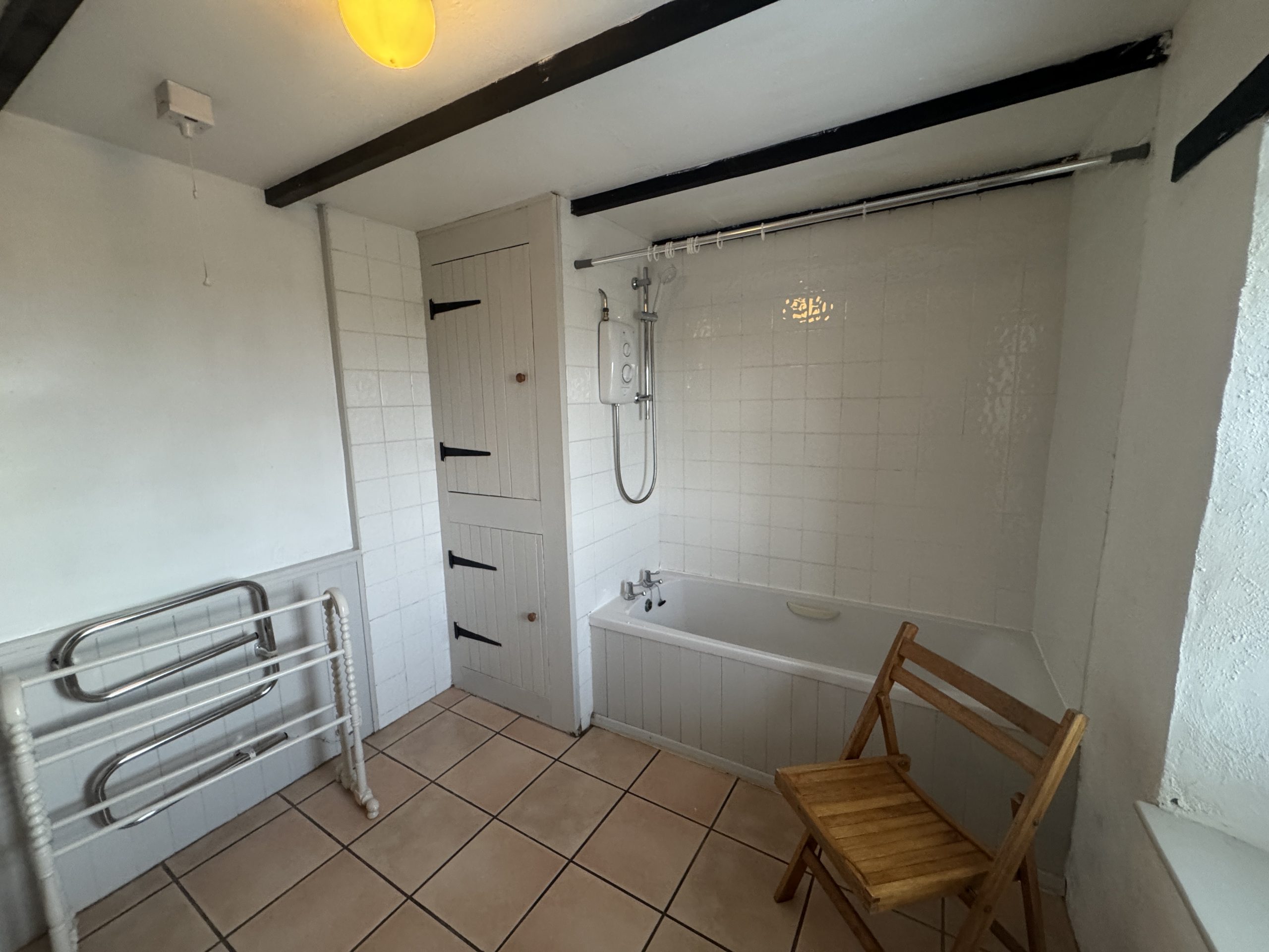Bulkhead light, tiled floor, ceramic washbasin, low level WC, plastic bath with electric shower over.  Cupboard housing hot water cylinder.  Heated towel rail.