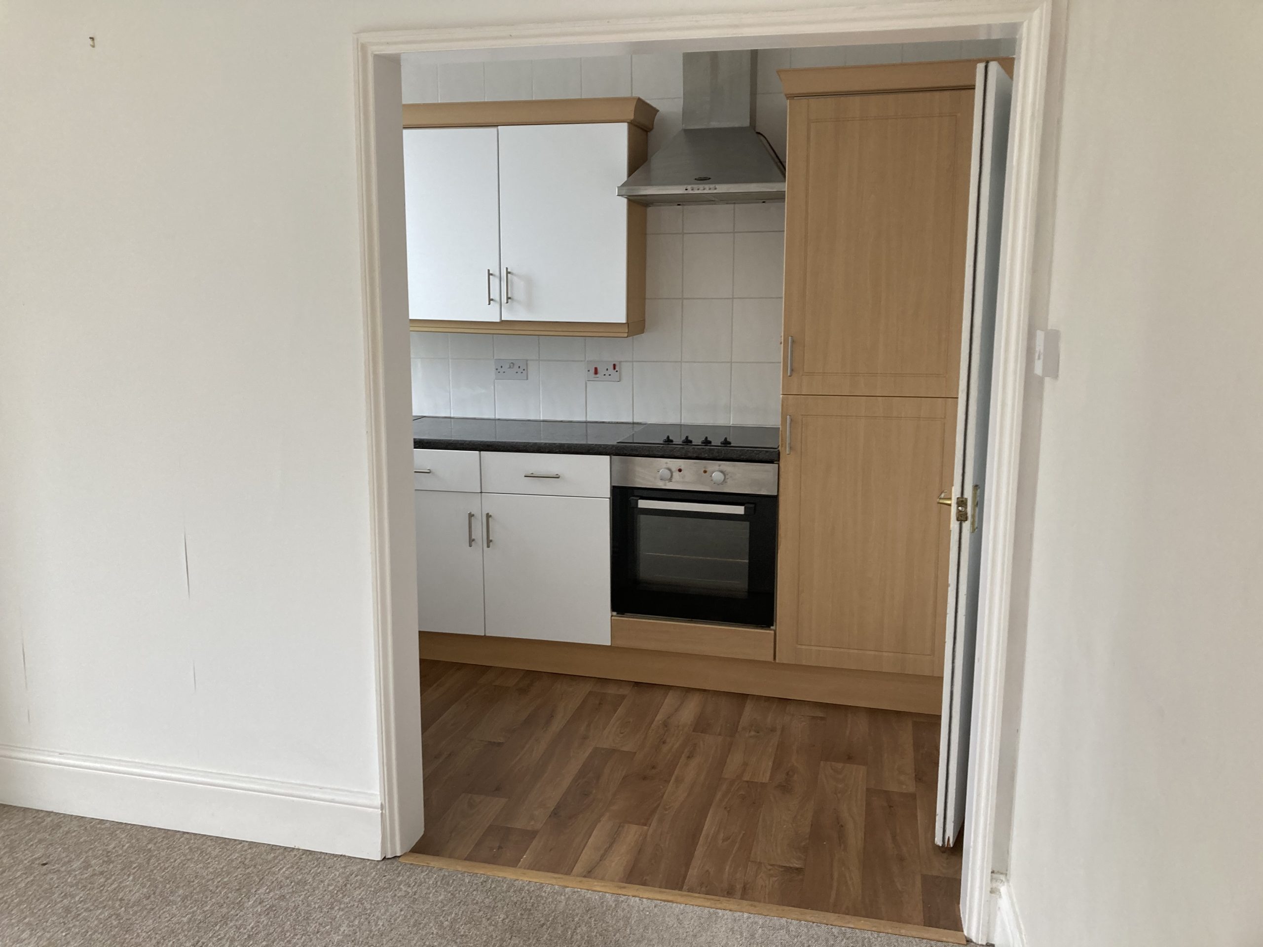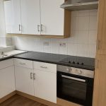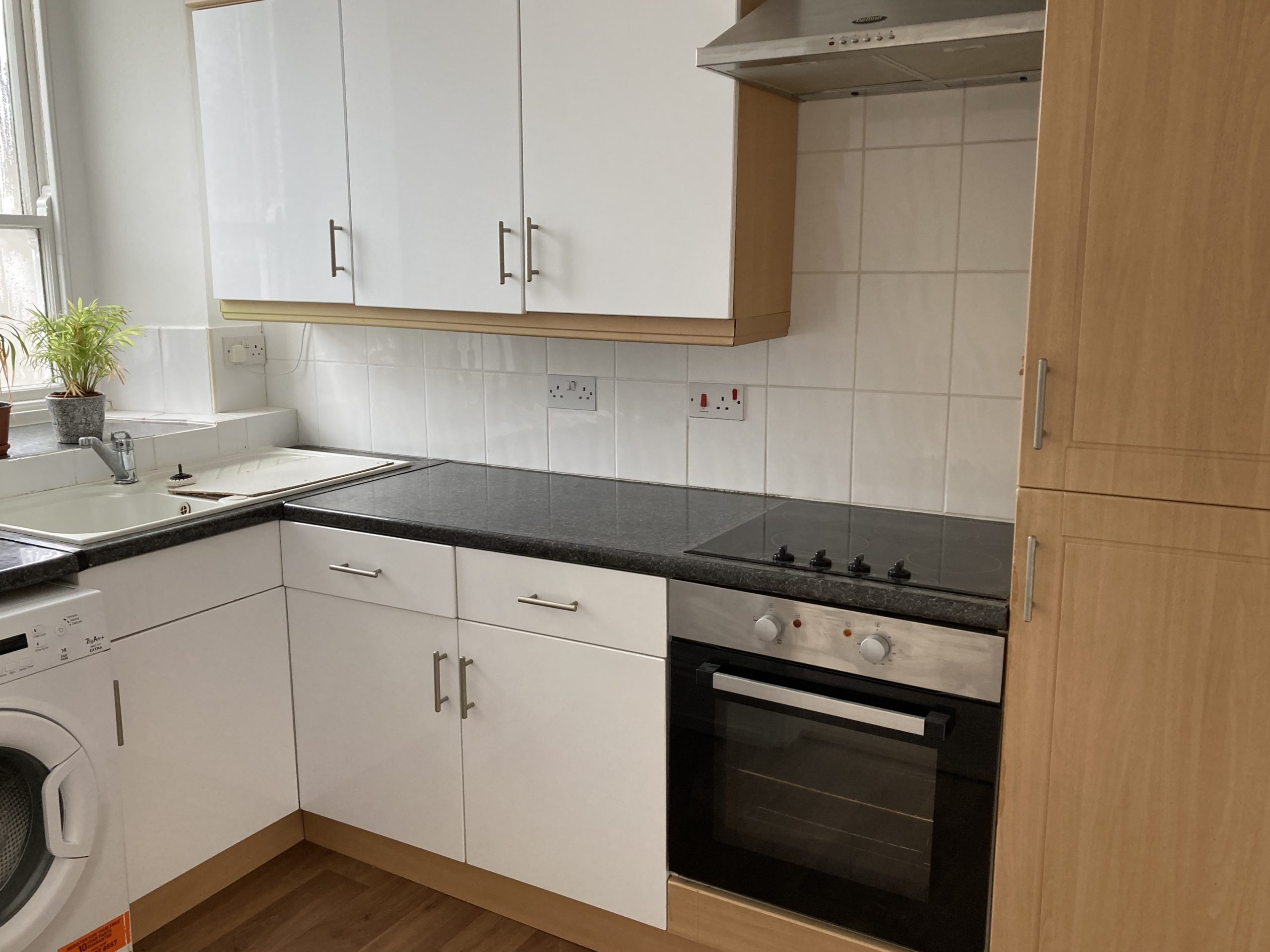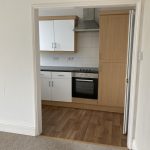 – Window to side. Worksurface area with inset sink and drainer. Cupboards and drawers below. Washing machine. Inset electric oven with integrated hob over along with an extractor fan above. Tiled surrounds. Cupboards above. Integrated fridge/freezer. Open throughway