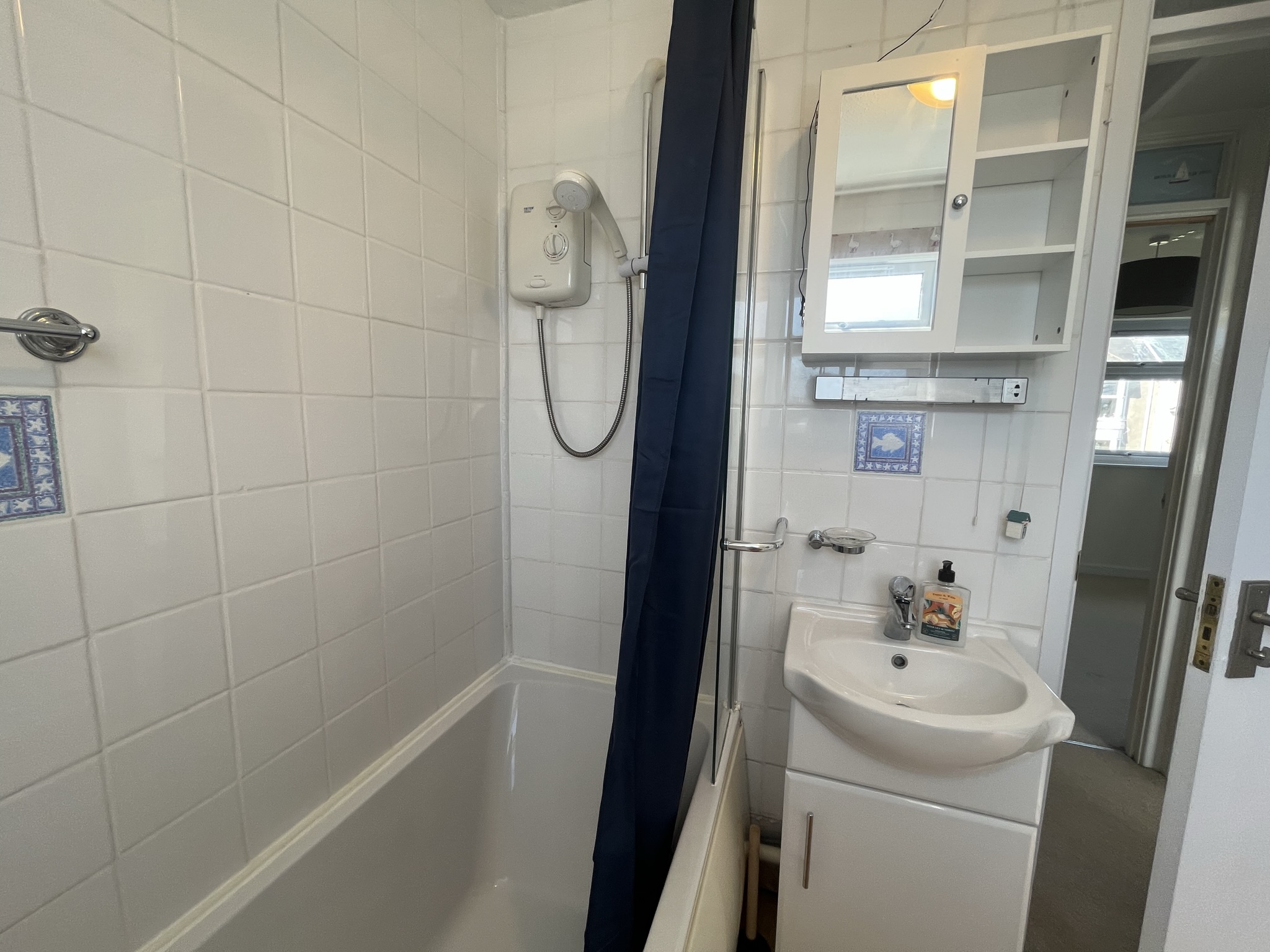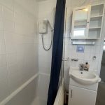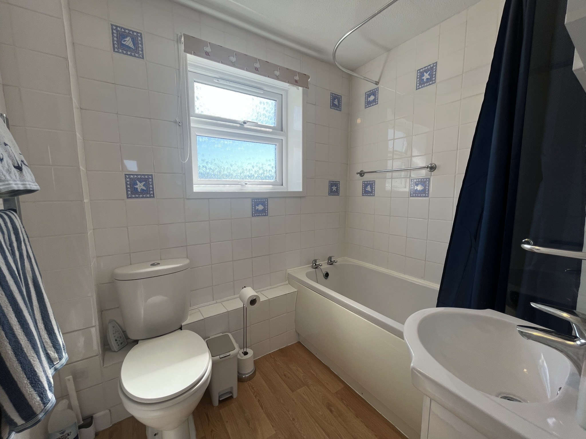 White suite with shower over bath, heated towel rail, medicine cabinet, double glazed window, tiled walls, bulkhead light and vinyl flooring.
