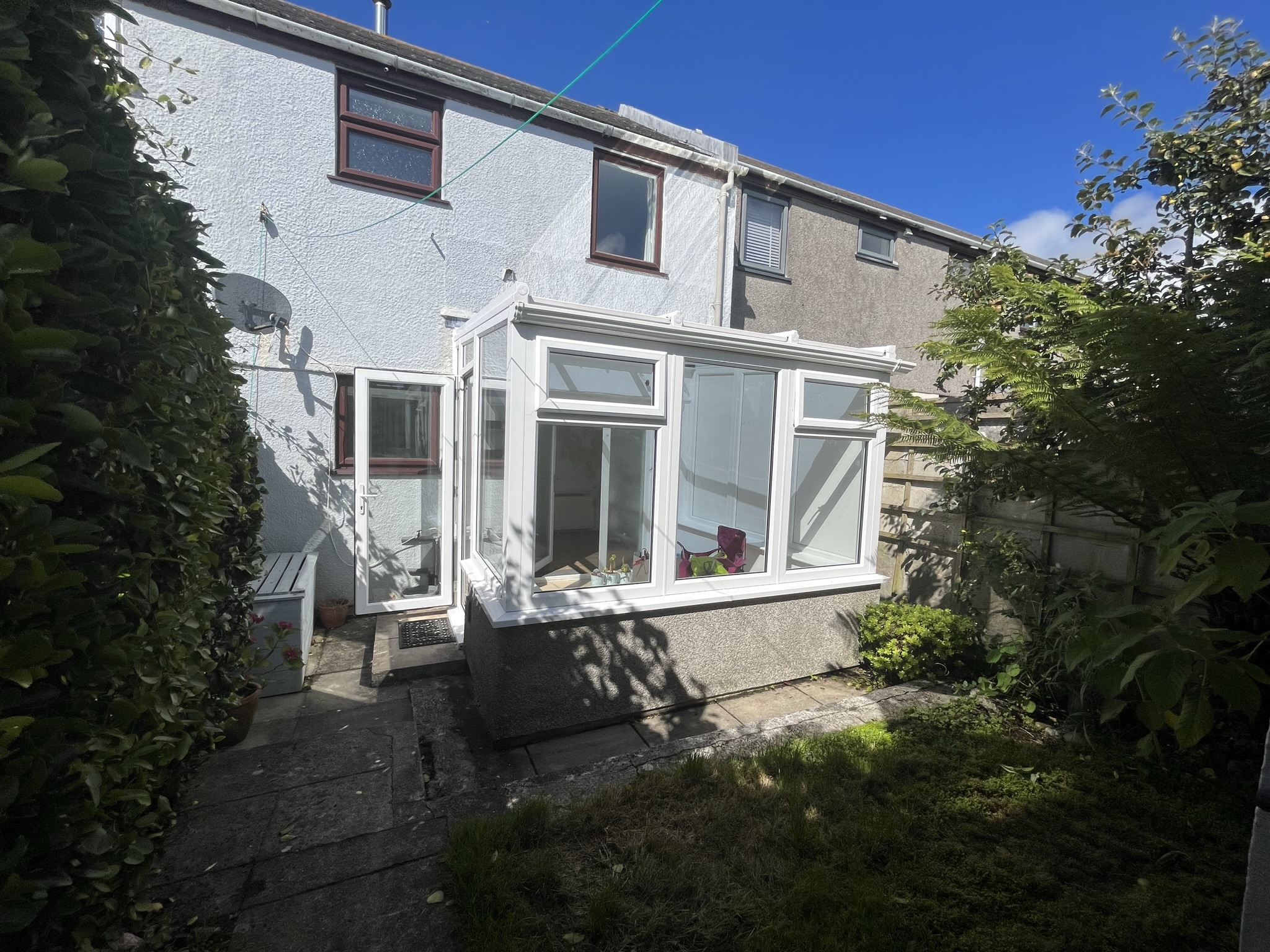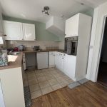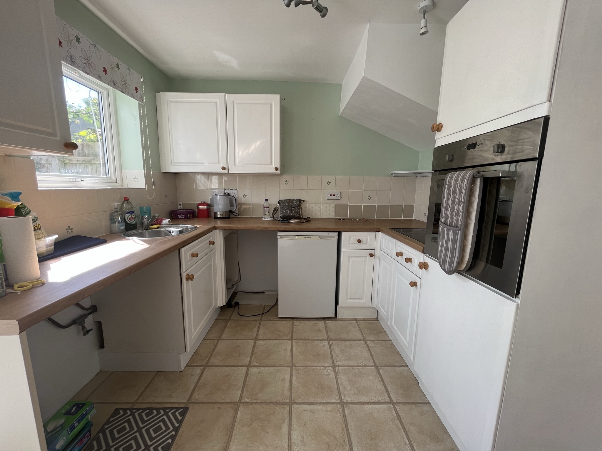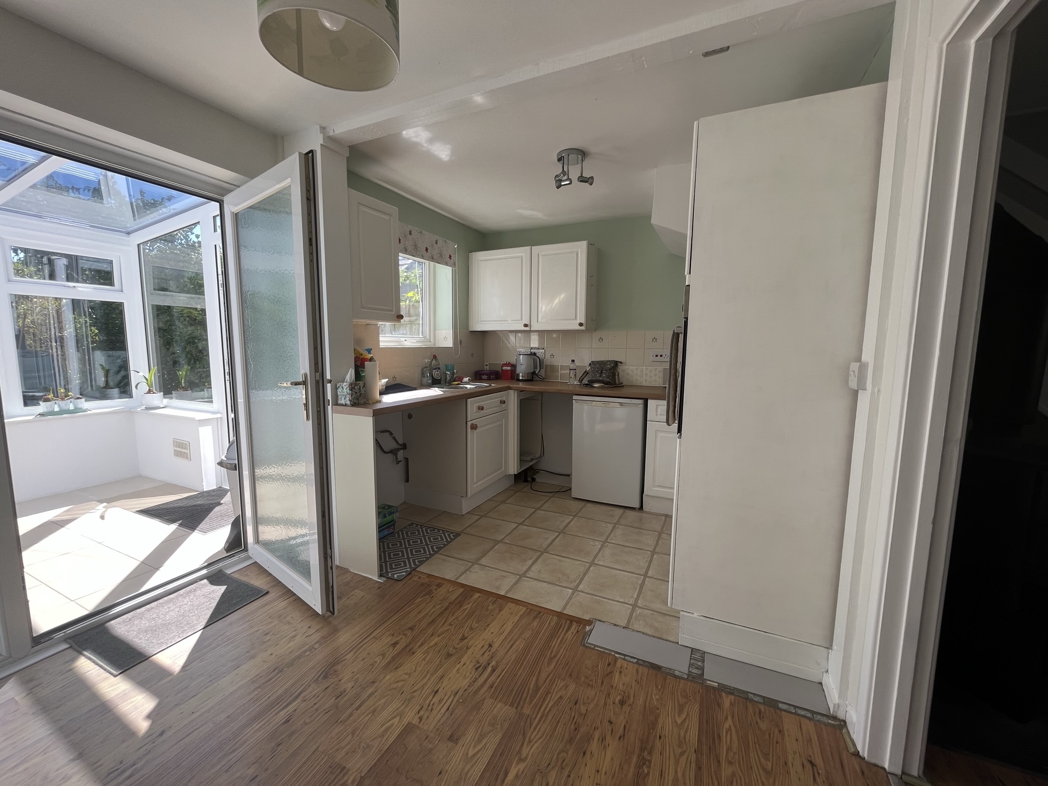 Fitted units, stainless steel sink, rolled edge worktop, hob, oven, plumbing for washing machine, double glazed window, night storage heater and door to conservatory.