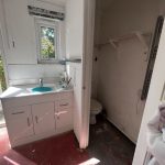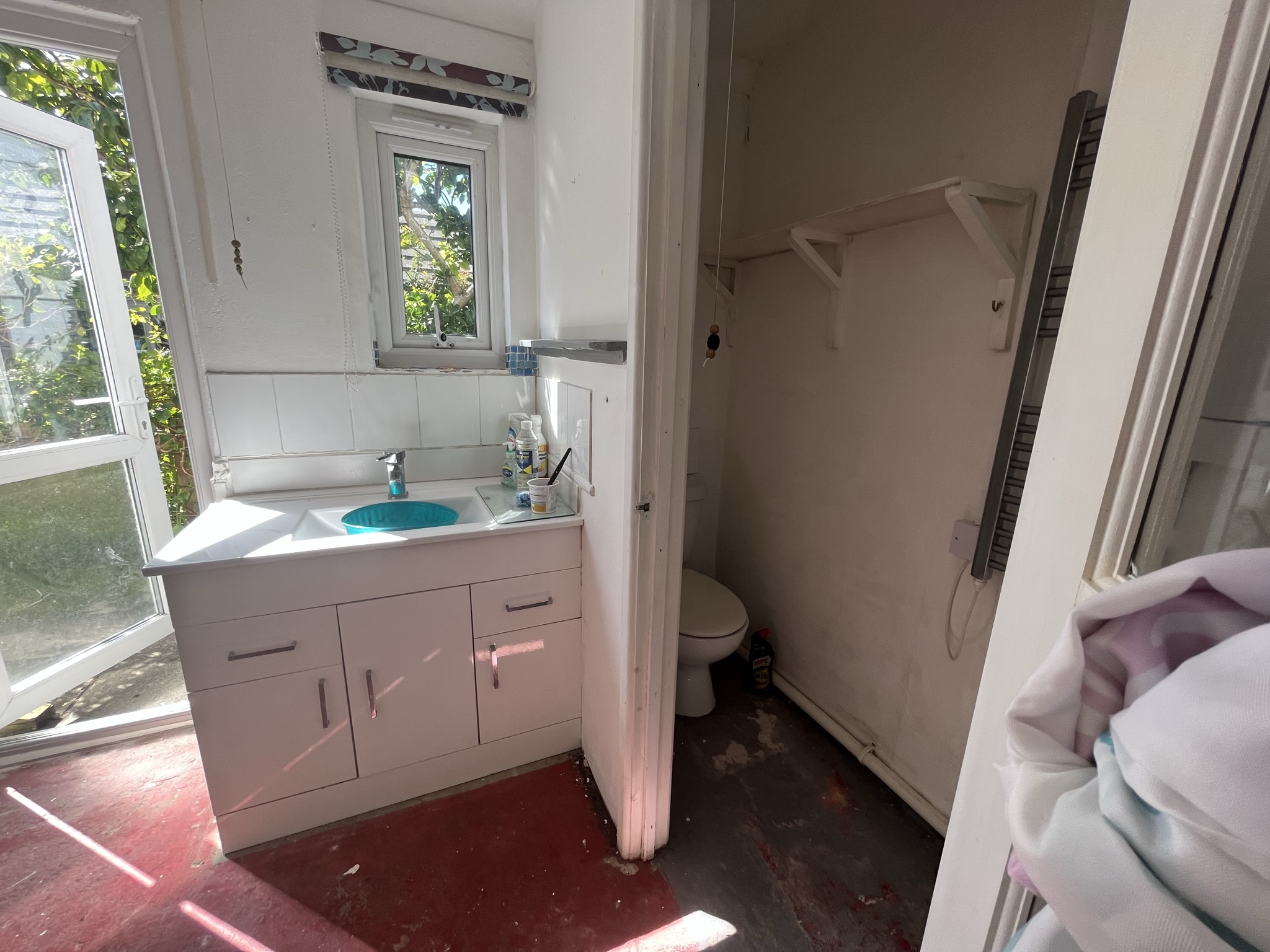 Double glazed door and window, sink, WC , basin and concrete floor.