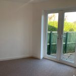 Pendant light, carpeted floor, central heating radiator and french doors to garden.