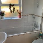 Shower over bath, low level wc, pedestal washbasin, heated towel rail, bulkhead light, frosted upvc window and tiled floor.